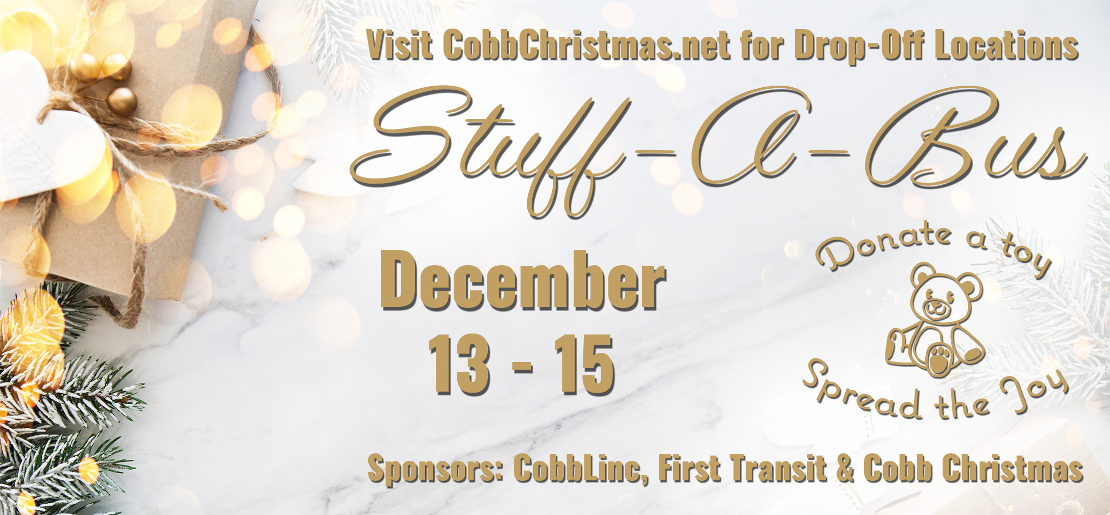 It’s that time of year when a specially-wrapped CobbLinc bus travels throughout the community to promote Stuff-A-Bus, an annual donation program benefiting Cobb County families. Stuff-A-Bus is made possible by Cobb Christmas, Inc., CobbLinc, First Transit, community businesses and volunteers. To participate, bring a new, unwrapped toy to any of the Stuff-A-Bus host sites listed below before the scheduled pickup dates and times. Toys are needed for children ages 3 to 13, with the 9 to 13 age group having the greatest need. Donations will be distributed to approximately 1,000 Cobb County families.